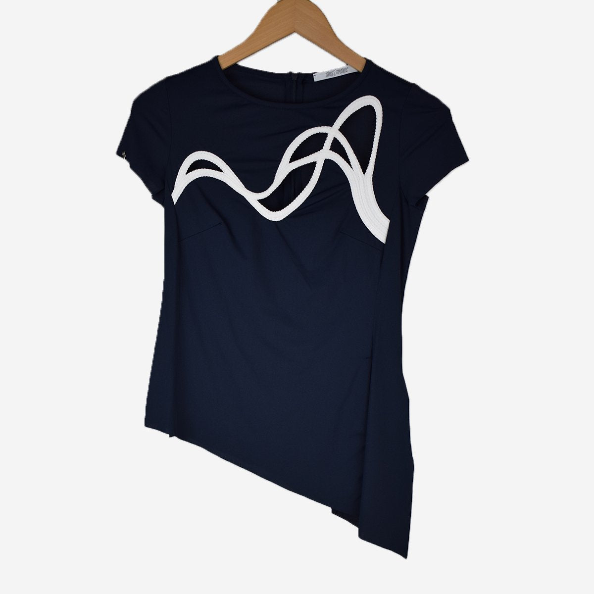 Stylish navy and white top by Oblique Creations, open work in white on the front, perfect worn over white jeans or the matching pants from this stunning range.