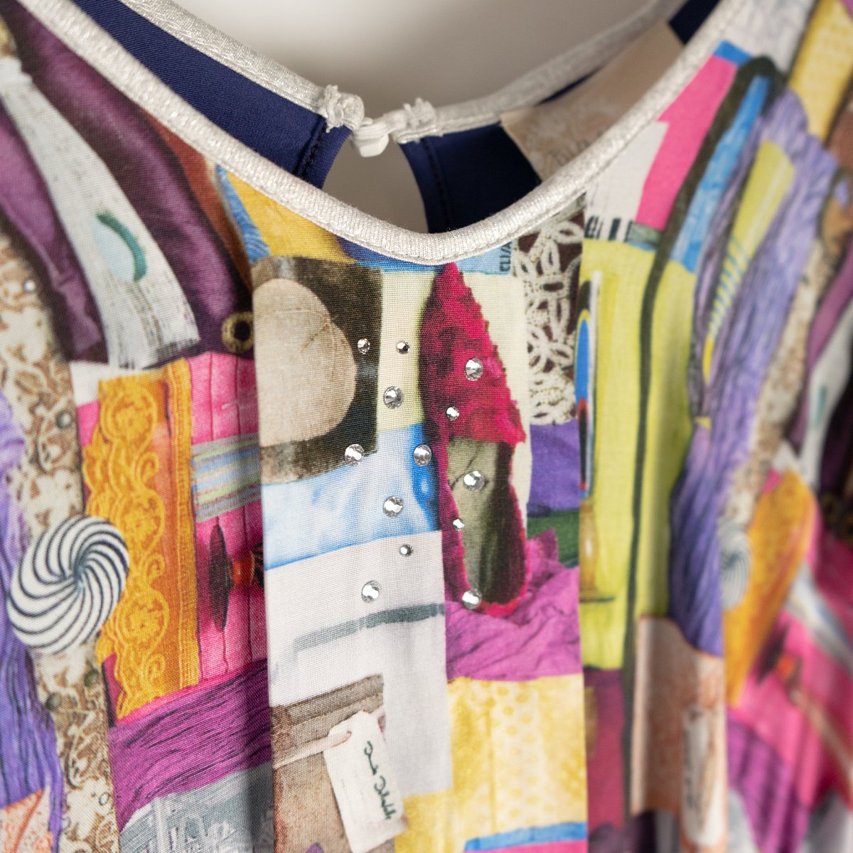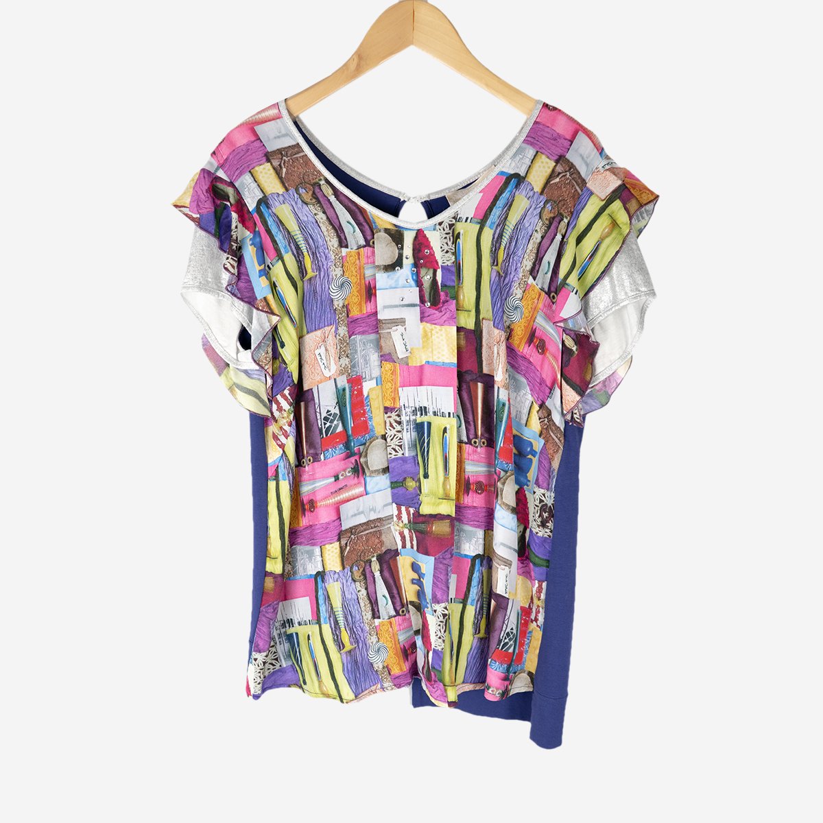 Stunning multi coloured T shirt by Elisa Cavaletti with frilly sleeves and a plain back with cut out to the neck, super stylish worn over cropped pants/skirt for a sunny weekend look. Perfect for holidays paired with linen pants, add in a wedge for an on trend look.