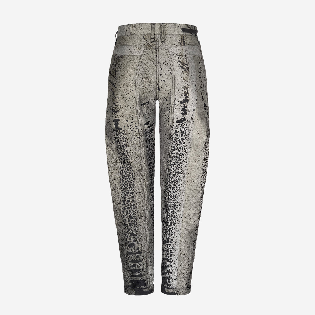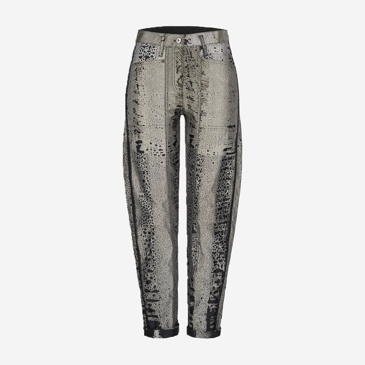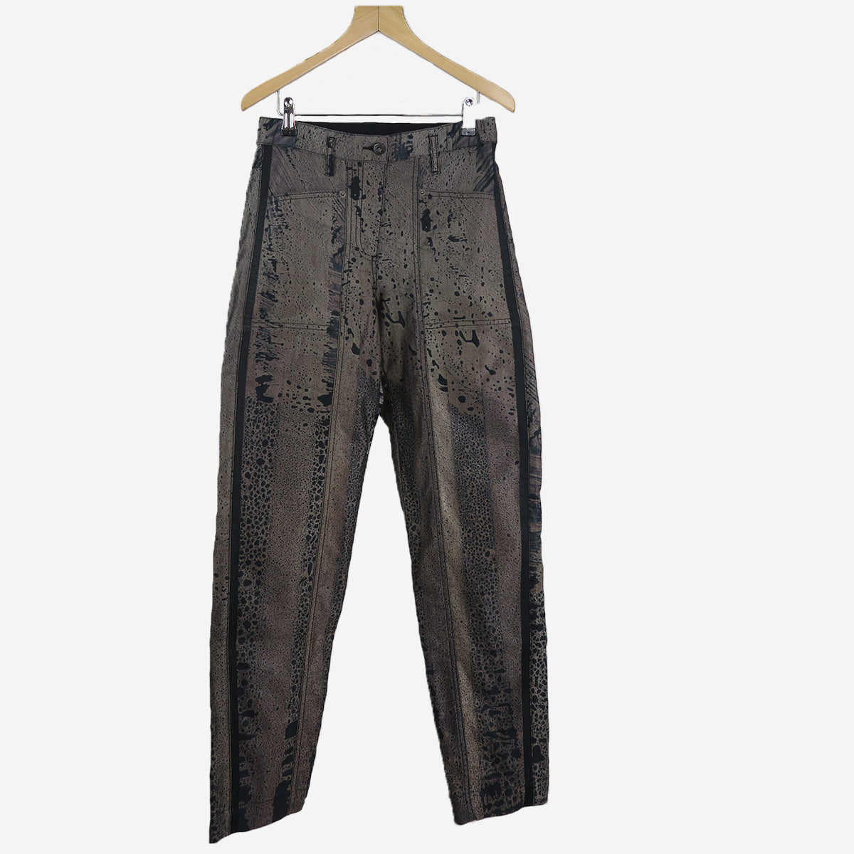 Trousers by Annette Görtz in a graphic print with multiple shades of brown and black. The edges of the pockets have black stitching. Along the sides is a black trim. These pants can be washed at 30 degrees.
