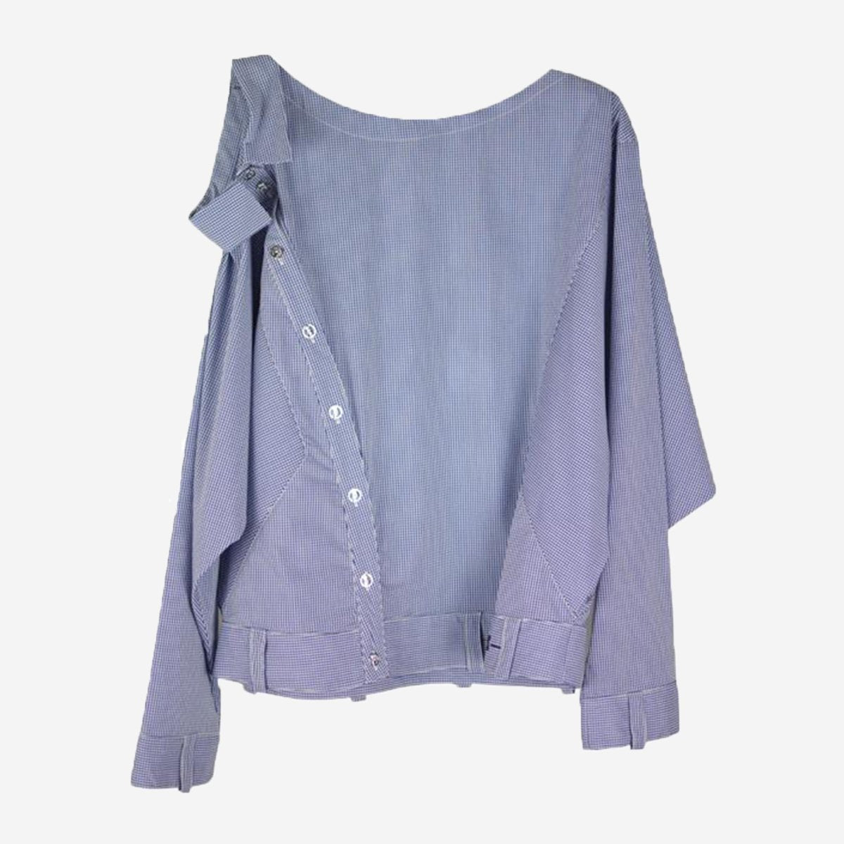 Stunning batwing round necked shirt with quirky collar on the shoulder, zip detail to the back, an asymmetrical button detail to the front and a fitted waistband by Oblique designs. Stand out from the crowd in this show stopper, wear with navy pants, add heels for a dressy evening look, or dress down with your comfy jeans.