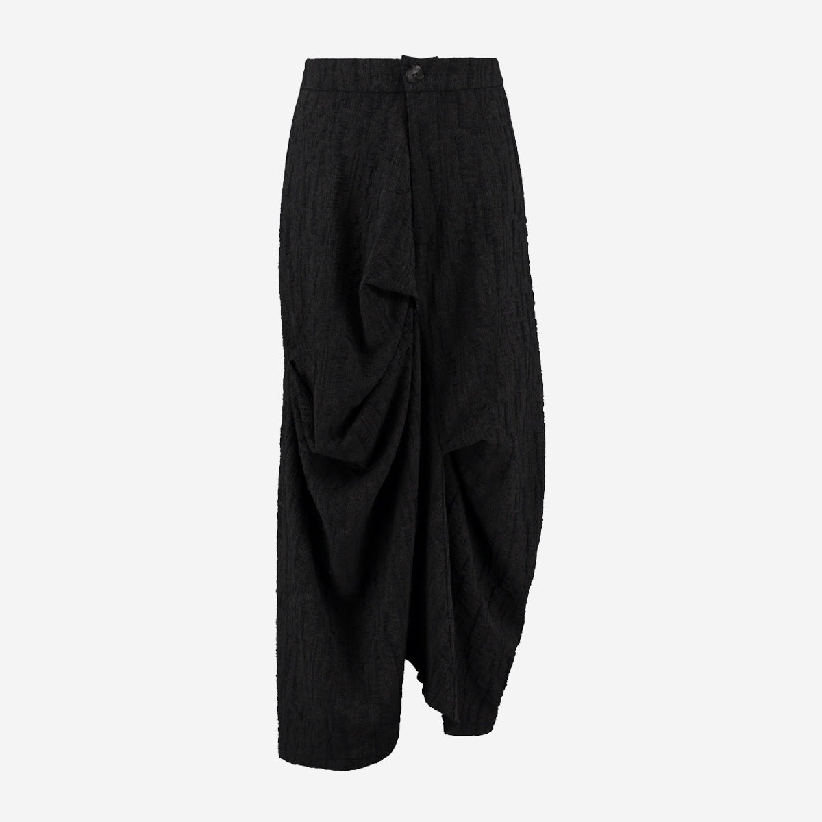 Dramatic drop-crotched trousers with asymmetric draping. Make an entrance with these spectacular strides. Made from our gorgeous textured jacquard with a slight stretch, they are expertly tailored with an irregular pleats and drapes to give a dramatic silhouette from every angle.