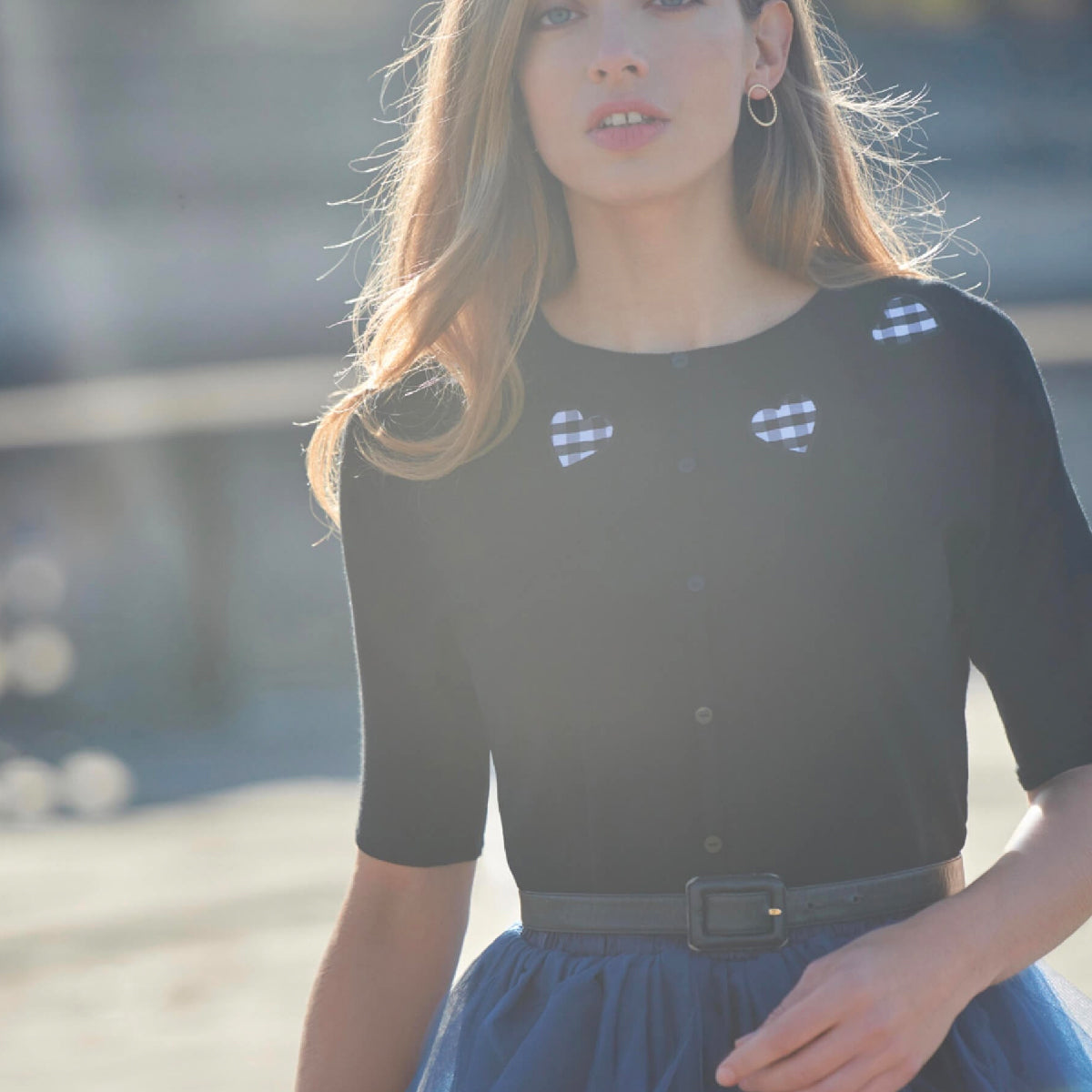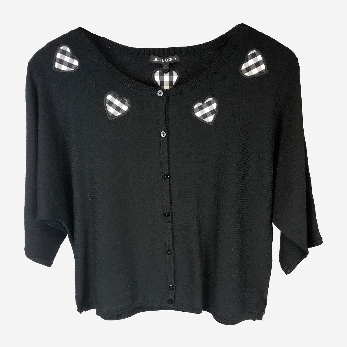 Striking short sleeved Black cardigan with black and white hearts around the neckline, button through so can be worn as a top/cardigan.