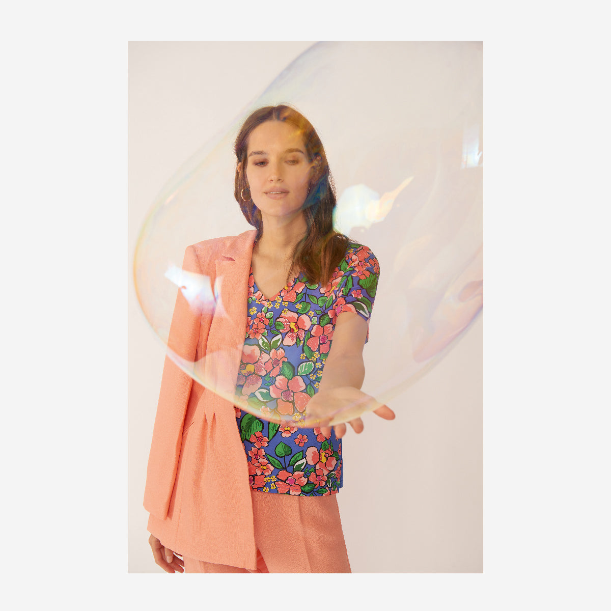 Striking blue based printed top with multi coloured embellished flowers and a plain blue back.