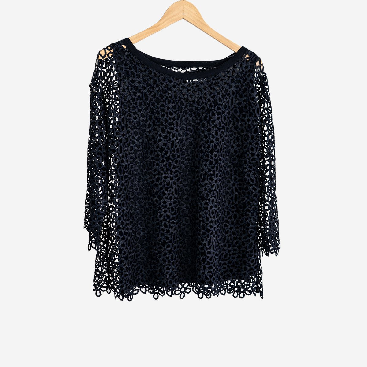 Lovely long sleeved lace top with lining and a wide round neck, perfect over linen pants/cropped pants for a cool on trend look.