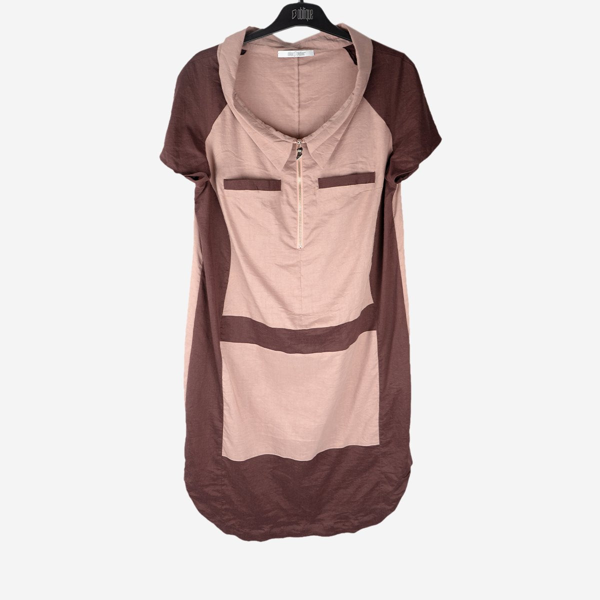 Stunning short sleeved linen dress by Oblique two tone fabric with zip detail to the front and cut up at the sides. Perfect with high wedges or dressed down with your favourite runners.