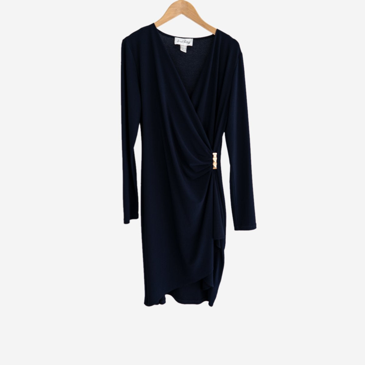 Fabulous dress by Joseph Ribkoff a real show stopper. Easy to wear and very flattering with three gold squares to the side, perfect for all your events. Looks like a wrap over dress but it is fully covered over the legs.