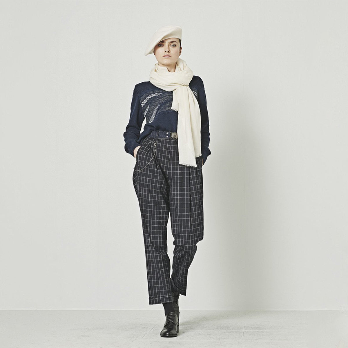 "Boy" pants in navy and cream check Virgin wool mix. High, soft waistband faced with self fabric belt loops and fly front fastened with a silver metal zip. Worn with polka dot stretch elastic belt with silver metal HIGH disc buckle. Fronts have double pleats and centre front crease. Slanting side pockets with silver metal mini-stud detail. Reverse has two-way jet pockets with button down flaps.