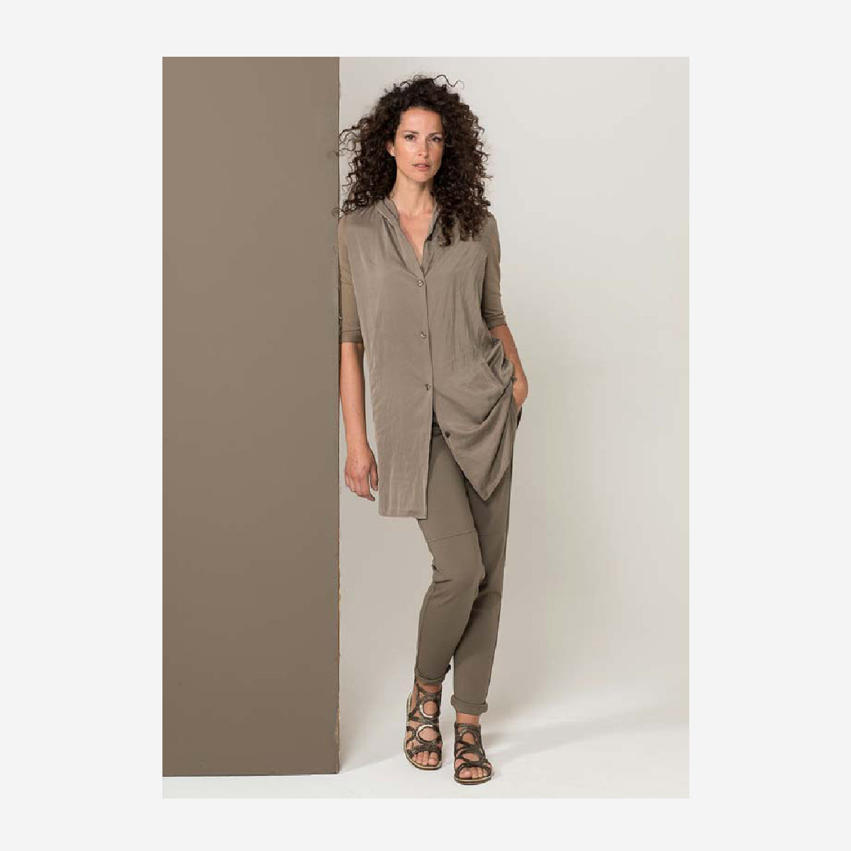 Easy to wear tunic by Ania Schierholt button through so can be worn as a tunic or jacket, wear with the trousers from the same range and the little sleeveless top for endless options of wearing this ensemble. It has pockets at the front.