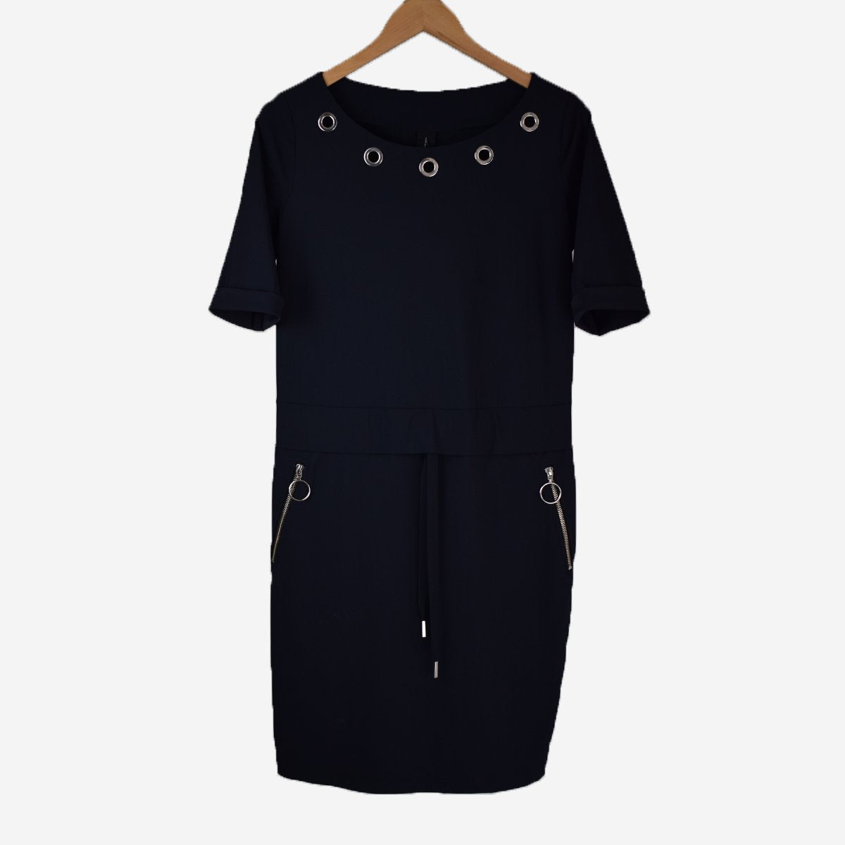 This navy blue two piece dress by Jane Lushka falls above the knee and features short sleeves, a drawstring waistband, contrasting pockets and neckline and striped cuffs.